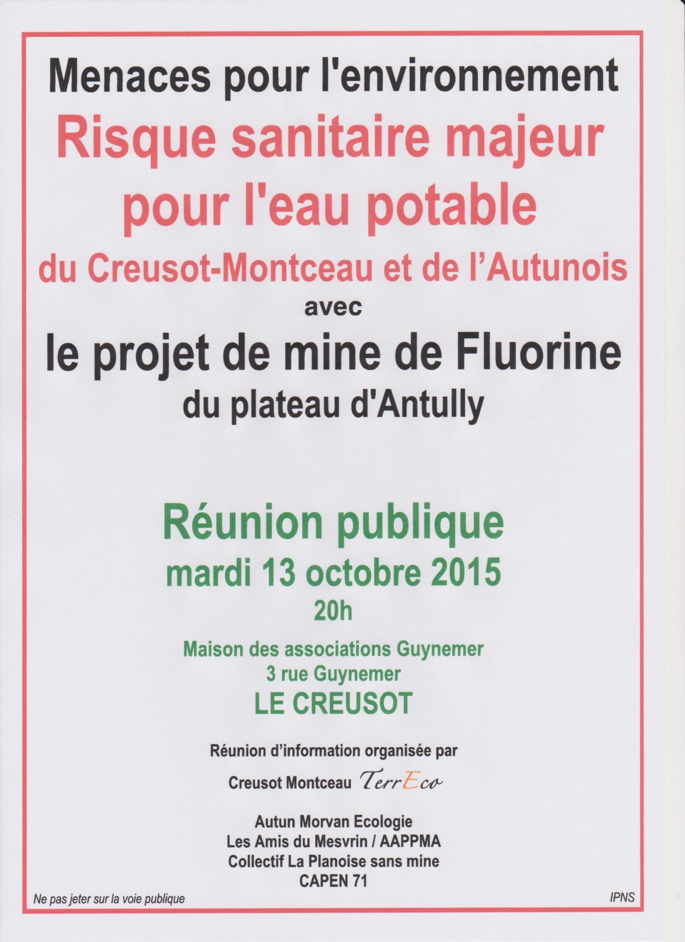 -Février 2016 : Le groupement des associations opposées au projet de mine de fluorine a réalisé le vendrdi 5 février une réunion d'information à Autun. 80 personnes ont assisté à cette réunion. De nombreuses questions ont été soulevées par l'assistance. Les échanges ont été vifs parfois mais courtois. M. Perrin d'Autun Morvan Ecologie a fait un exposé complet sur les risques sur la santé. Les riverains d'Antully présents dans la salle ont aussi exprimé clairement leurs craintes et leur désarroi.